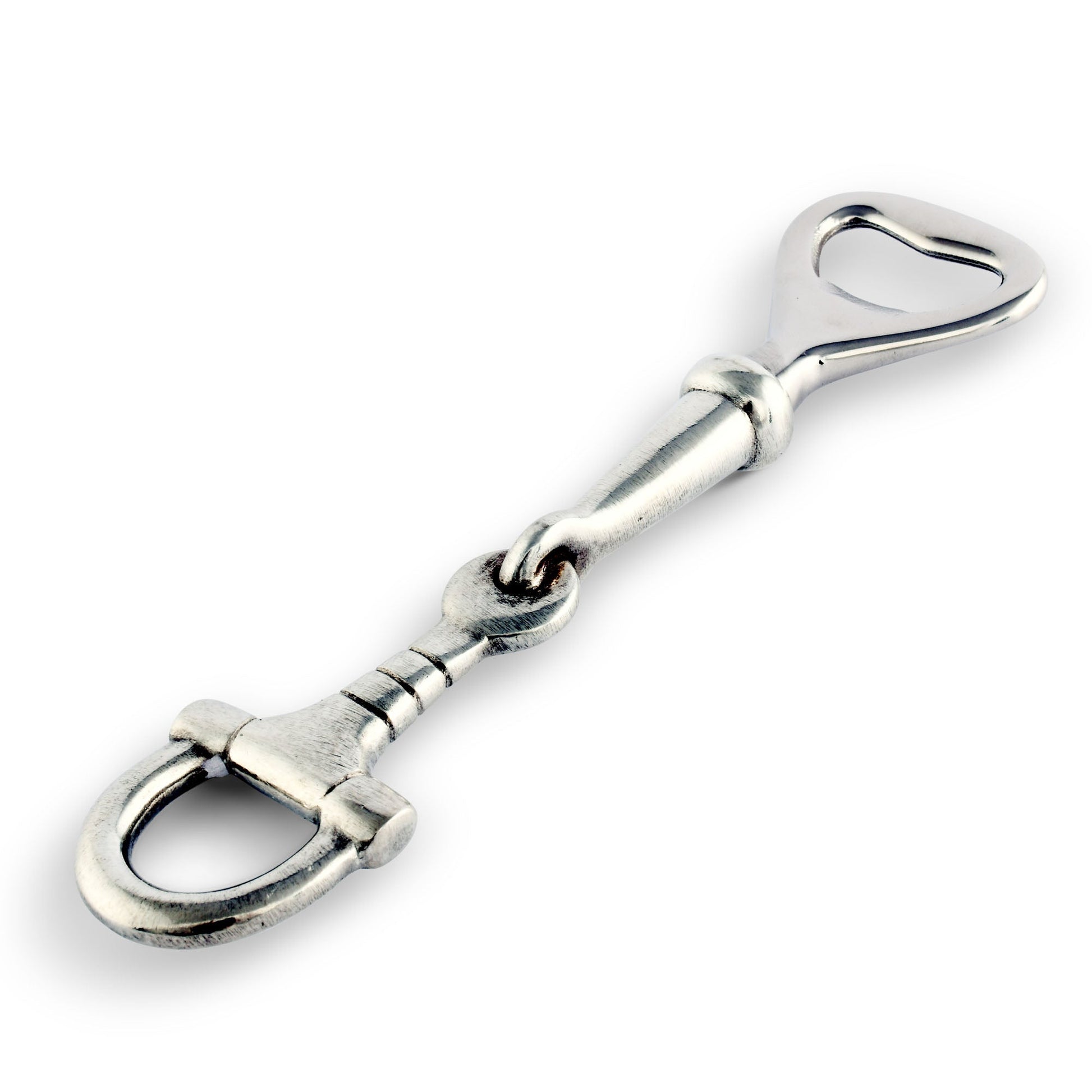 Embrace the equestrian lifestyle with this premium Horse Bit Bottle Opener, an excellent blend of pewter and stainless steel. The masterful craftsmanship, mirrored in the equestrian-themed design, radiates luxury and has a rich luster that catches the eye. With a just-right size of 6.25''L x 1.5''W x 0.5''T, this robust opener effortlessly uncaps your premium bottled beers, adding to your barware's elegance. It makes a unique gift for horse enthusiasts and an ideal addition to any horse-themed entertainment room.