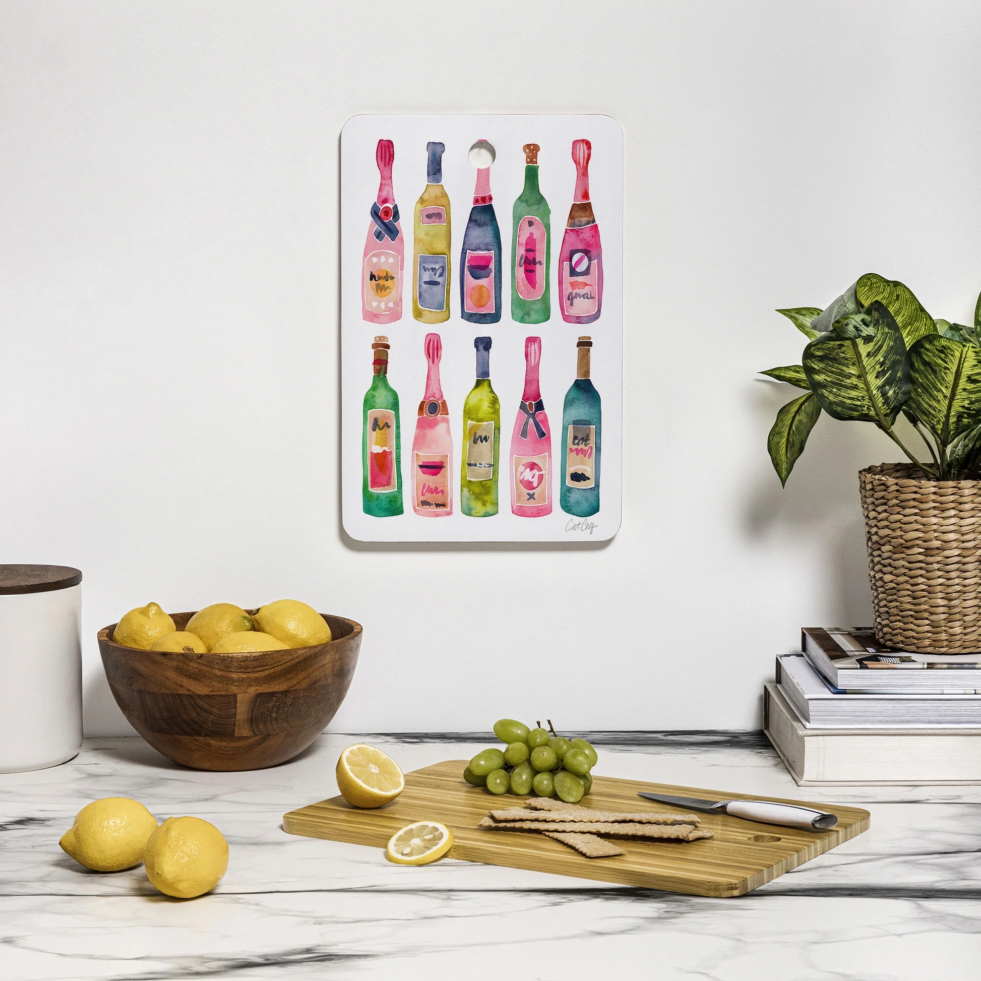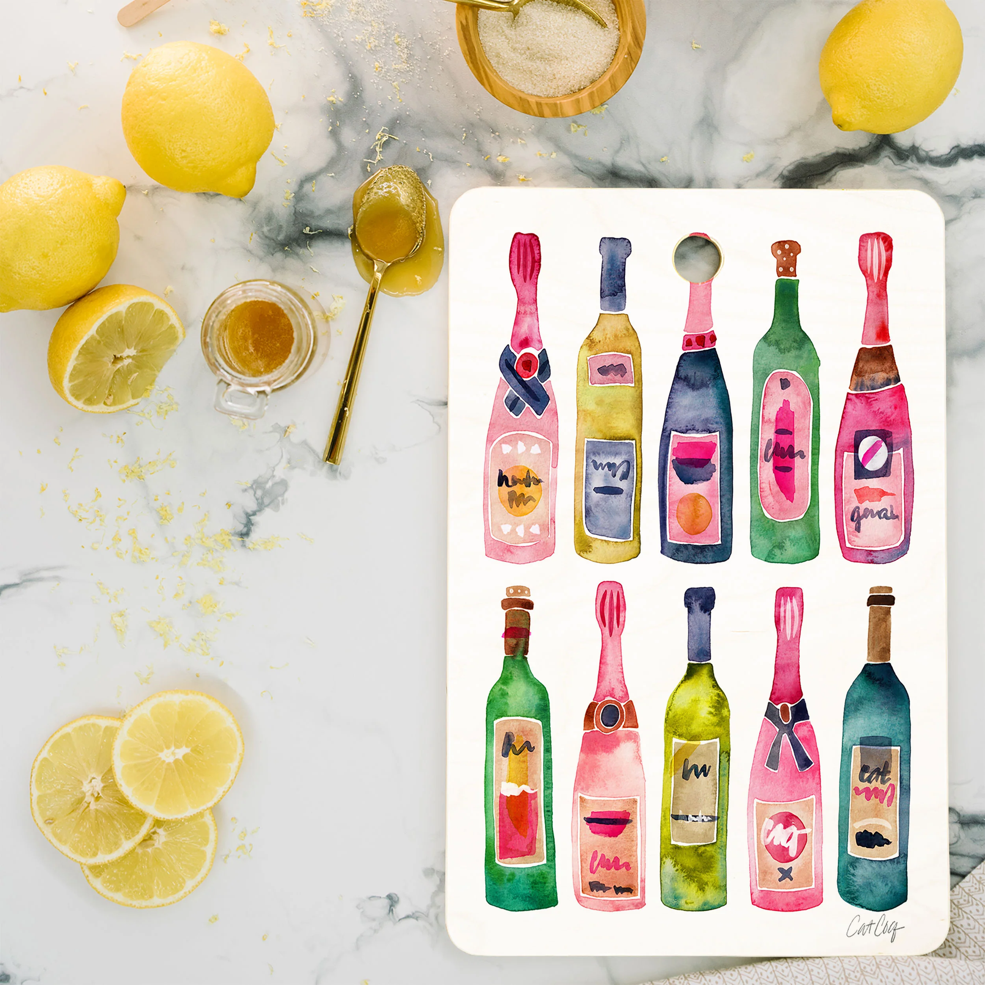 Display the artwork side which is permanently imprinted (with a protective satin finish) that will pop when displayed on your counter or hung on the wall through the 1" flush hole for handle. The prep side is a food-safe matte natural bamboo that can be easily washed with a non-abrasive cloth.