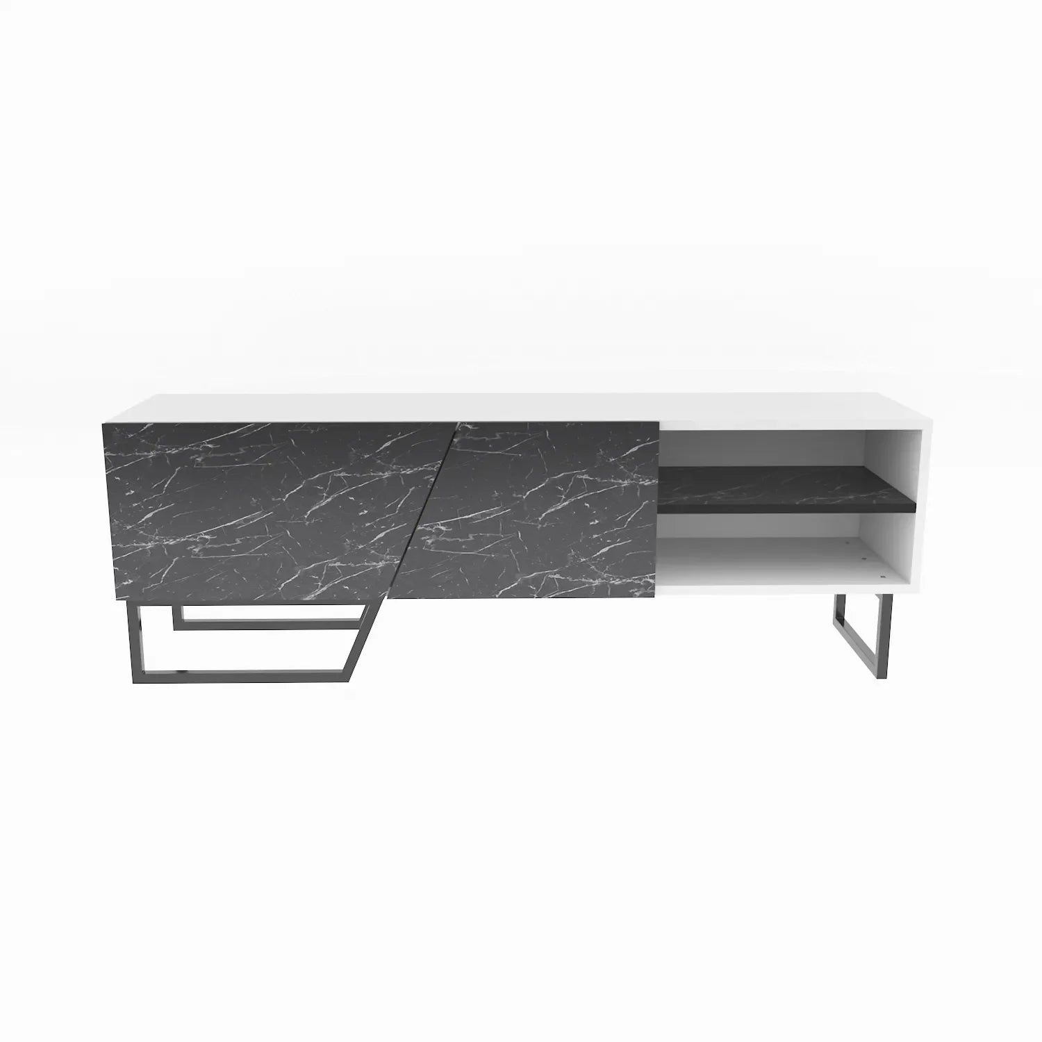 Introducing the Denasse 60" Wide Modern TV Stand, the perfect addition to elevate your living room. With its sleek asymmetrical design, metal accents, and contemporary look, this TV stand brings a touch of style to your space. Crafted from 18mm thick melamine coated particle board, it offers durability and scratch resistance, ensuring long-lasting performance.
