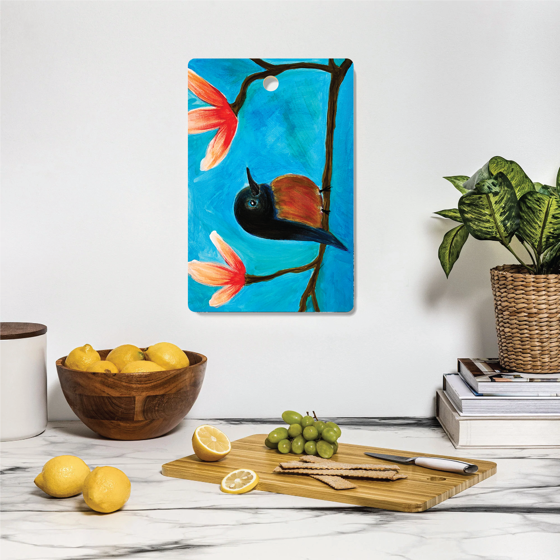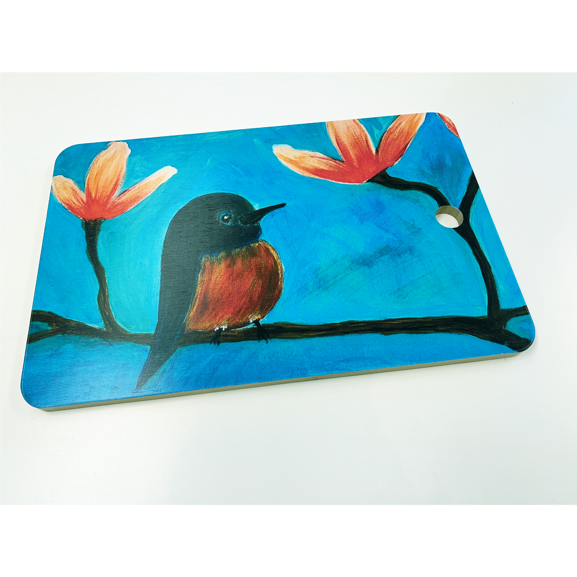 Display the artwork side which is permanently imprinted (with a protective satin finish) that will pop when displayed on your counter or hung on the wall through the 1" flush hole for handle. The prep side is a food-safe matte natural bamboo that can be easily washed with a non-abrasive cloth.