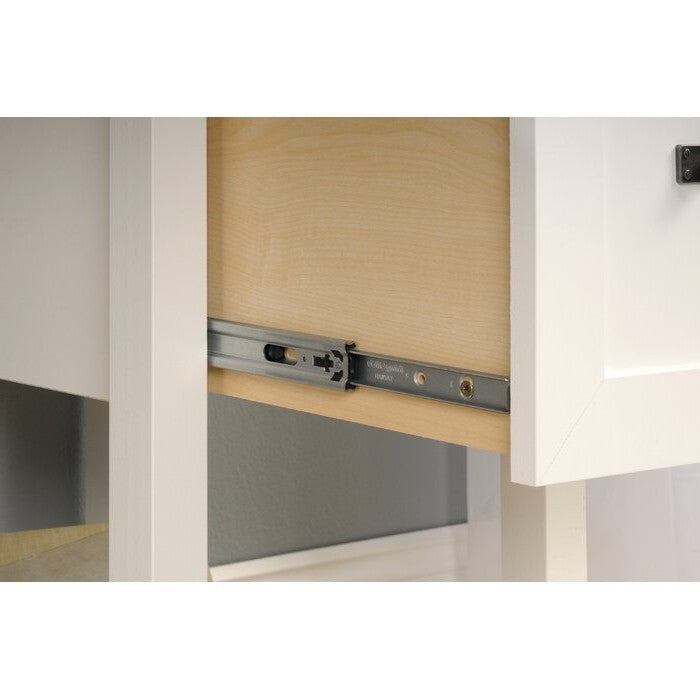 - Drawers with full extension slides feature patented T-slot assembly system.
