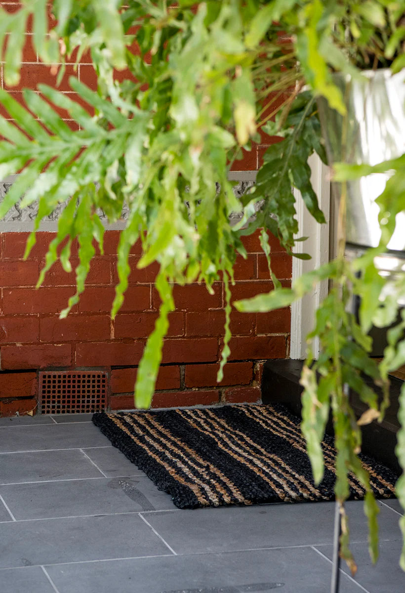 The Jones Stripe adds definition and a warm welcome, complimenting neutral home décor. It has a graphite background with natural jute stripes that run horizontally on the mat.