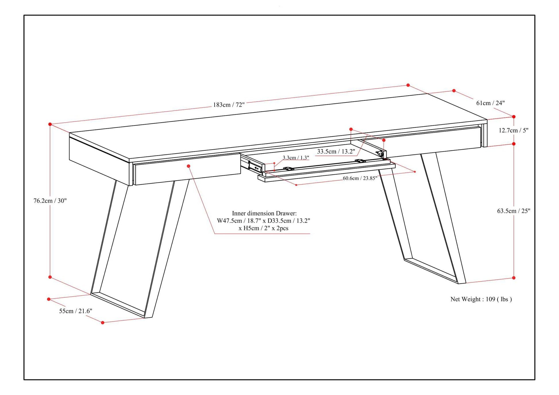 - Features a flip down pull-out keyboard tray and two (2) large deep drawers with metal drawer glides