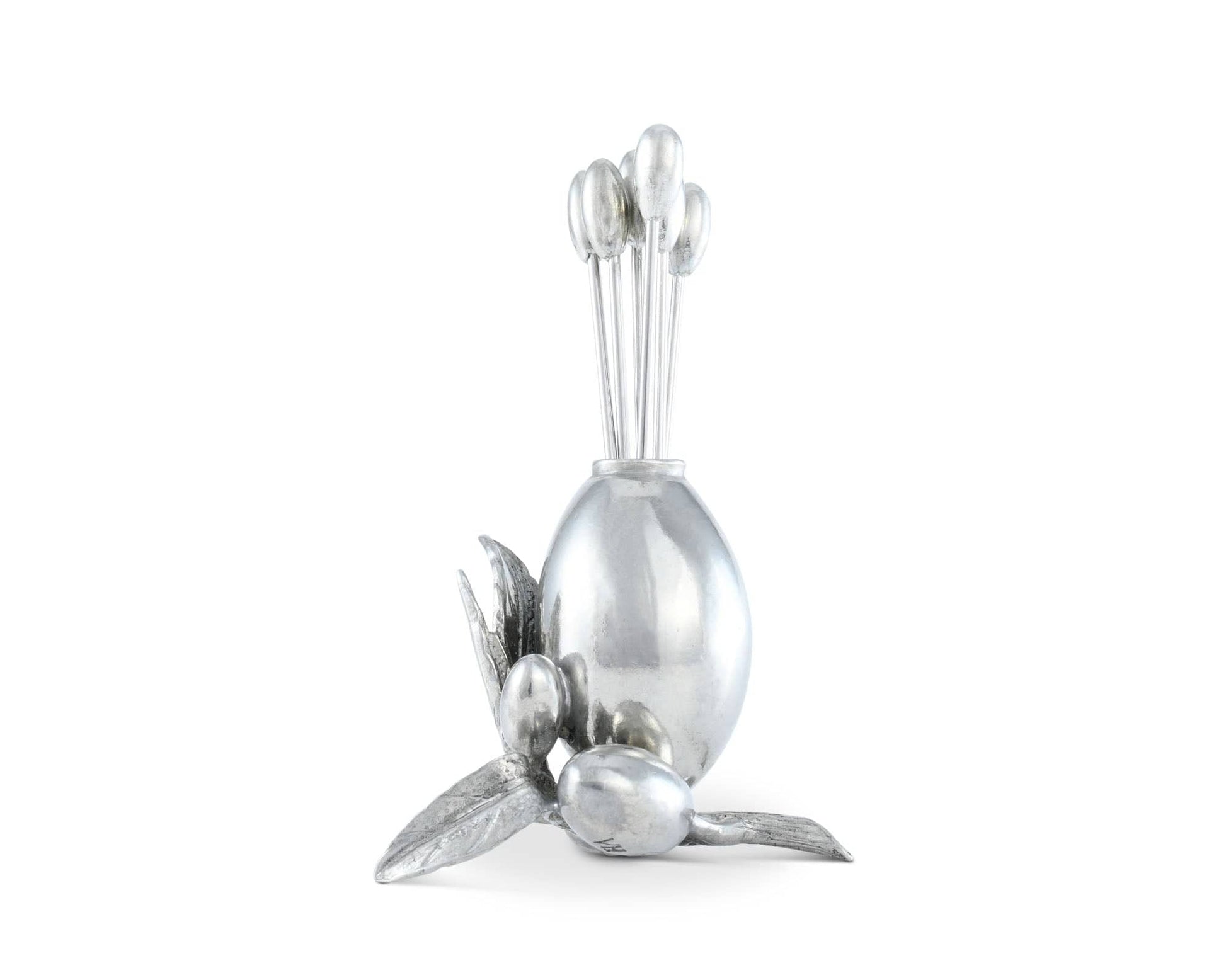 Dive into the art of entertaining with our best-loved olive cheese picks from Vagabond House in the Olive Grove Collection. Expertly hand-cast in sumptuous pewter as a miniature tableau of a fruit-laden olive twig, these picks not only serve but also enhance your table's aesthetic. The compact size, 1"W x 1.5"L x 4"T inches, makes these cheese picks perfect for intimate gatherings, allowing a neat placement of your selected cheeses. Six picks, each flaunting a tiny pewter olive, adds to the quaintness and uniqueness of this set, making it a luxury gift for cheese enthusiasts and entertainers alike.