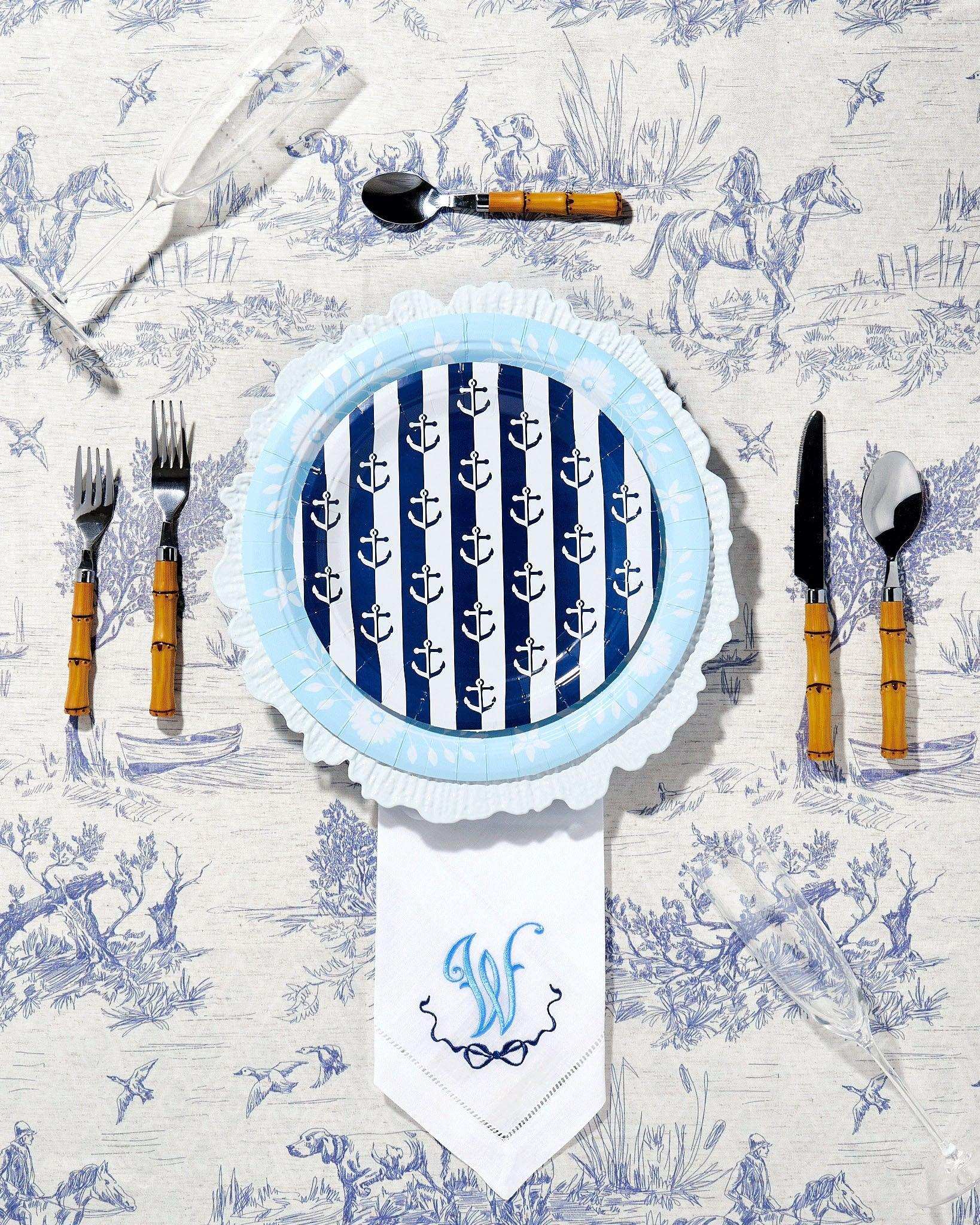 Our Anchor Away plate is a celebration of all things coastal. It's yacht club chic meets backyard barbecue. This disposable china paper plate is a summer must have. This 8 pack is available in a dessert size, measuring at 8.5 inches in diameter.