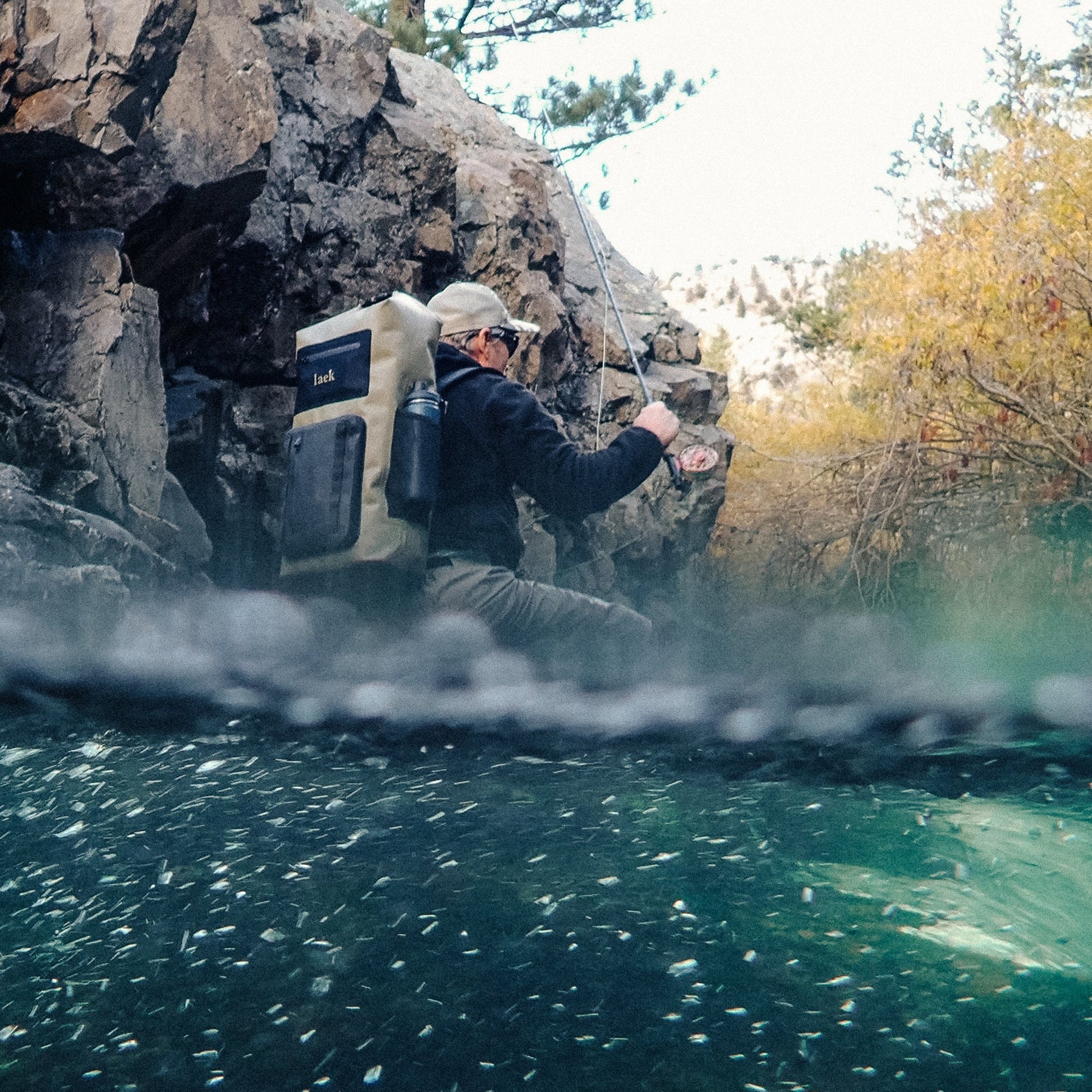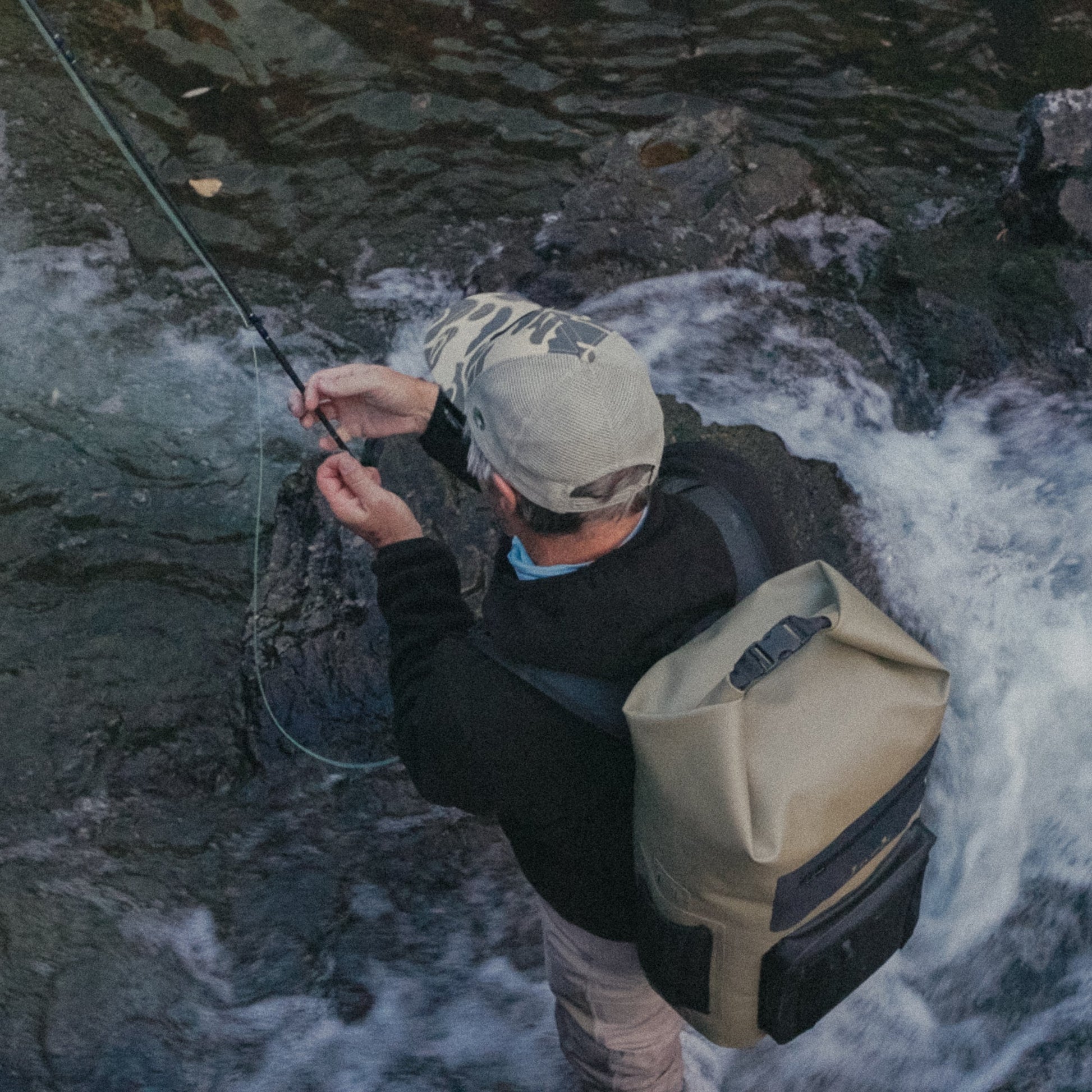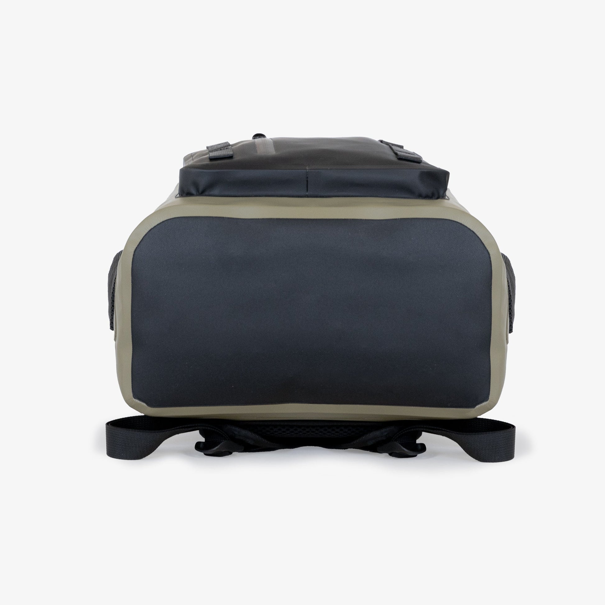 Our waterproof backpacks are designed for resilience and adaptability, keeping your belongings dry on the water or in a downpour. The rolltop closure provides easy access and extra capacity when needed. The pack features a sizeable protruding pocket, an upper soft shell pocket, two durable mesh water bottle pockets, and four attachment points for securing gear. Comfort is ensured with a structured back panel, soft padding, and cushy shoulder straps. Inside the pack is a mesh zipper pocket and velcro strips to attach a laptop sleeve. This submersible bag is made of recycled 600 denier polyester with a double-sided TPU coating for sustainability and longevity. On the bottom, a thick 1000 denier panel adds extra protection.