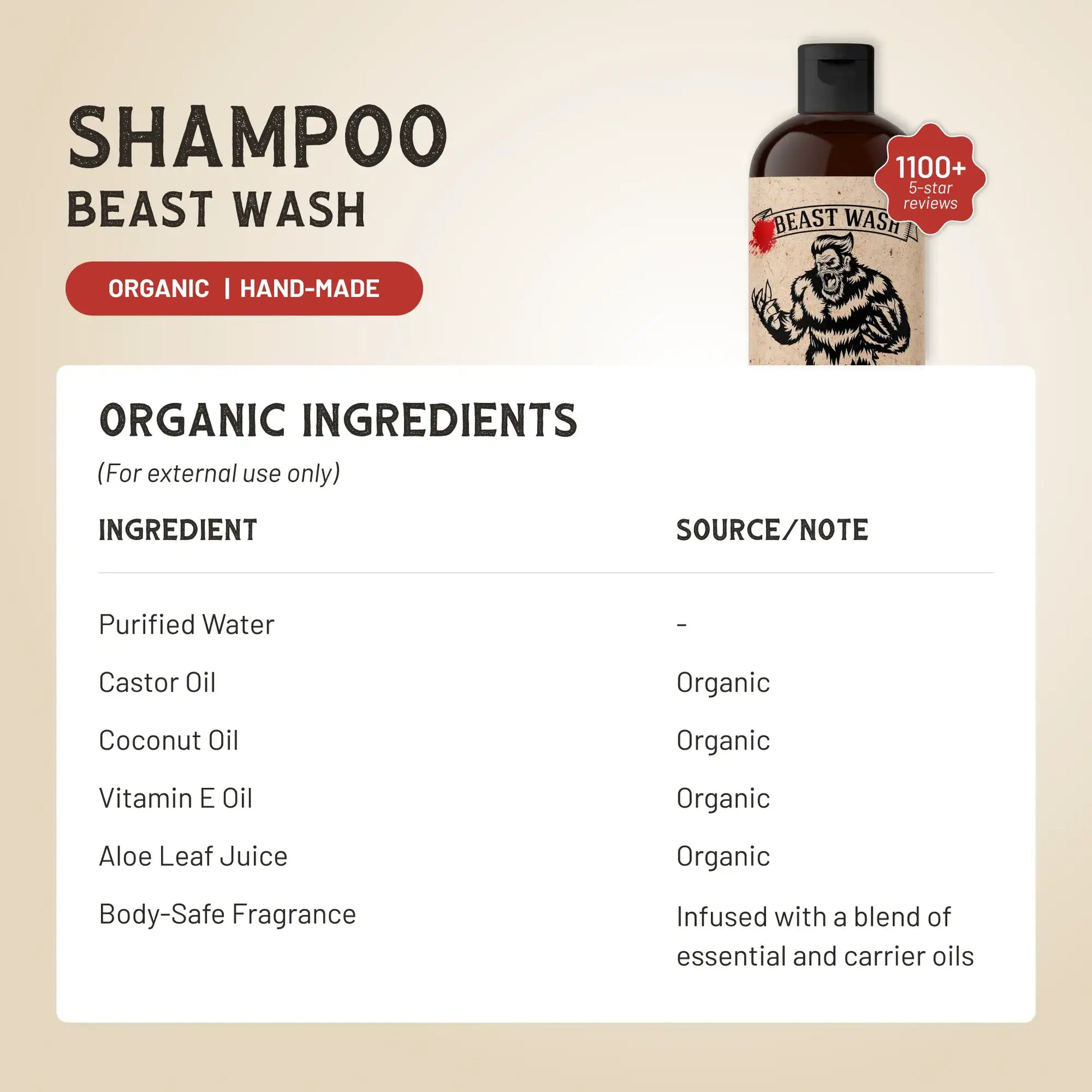 Our Beast Wash shampoo is designed to promote healthy hair growth without using toxic chemicals or animal testing. The organic, hand-made shampoo will help you treat dandruff, moisturize, and smell amazing all day, every day.