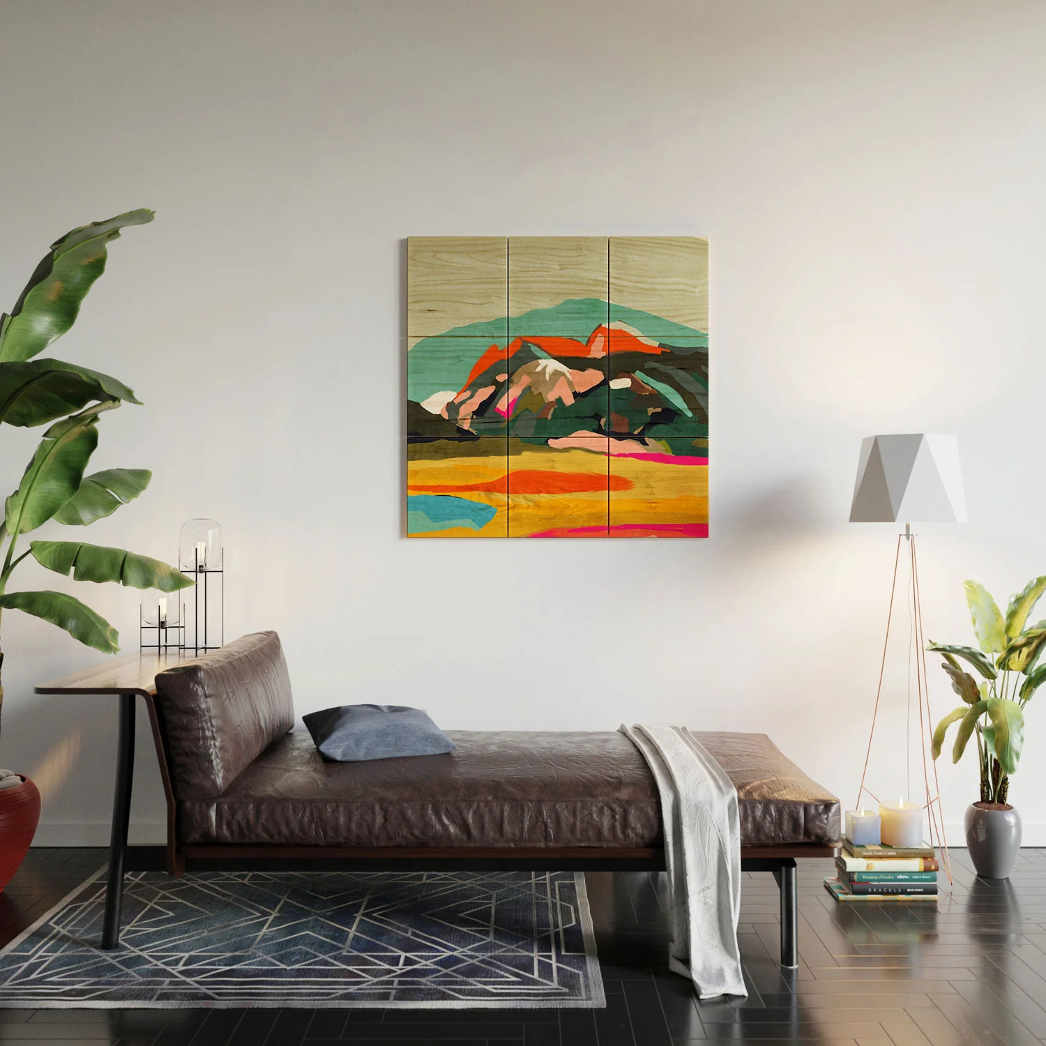 A set of nine wood wall tiles that you can arrange on your wall and adjust the space between each tile to create any number of different looks. Available in three sizes.